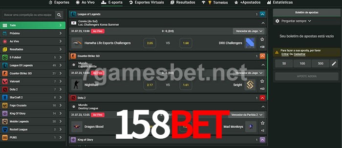 O 158Bet oferece uma grande seleção de opções de apostas em e-sports com probabilidades competitivas